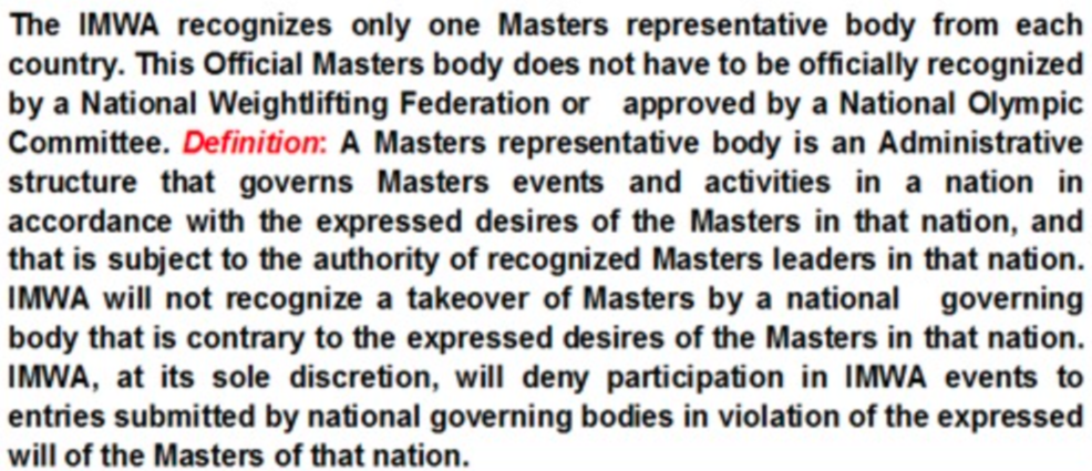 2.c. The new rule book specifies that the International Masters Weightlifting Association will only recognize national Masters representative bodies that express the desires of the Masters weightlifters themselves, and makes it clear that the IMWA will not tolerate interference by national sports governing bodies in international Masters weightlifting events, nor interference with any Masters weightlifter who wishes to participate in those events. Participation in World Masters Championships will only be open to entries submitted by Masters representative bodies recognized by the International Masters Weightlifting Association. Any attempts by national sports or weightlifting authorities to substitute themselves for a nation’s Masters weightlifters will not be recognized by IMWA, and IMWA will reject entries for IMWA events submitted by national sports governing bodies that are acting independent of, or against the expressed desires of a nation’s Masters weightlifters. The relevant section of the rule book (Section (3.1)